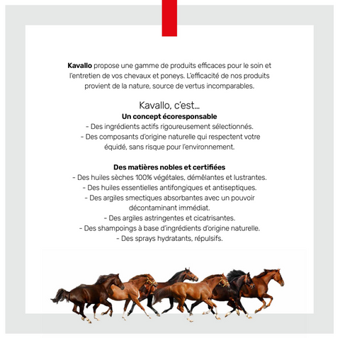 A base d’ingrédients d’origine naturelle, Kavallo offre ainsi une large gamme de produits de soins nécessaires au maintien de la santé cutanée du cheval, de ses poils et de es sabots.
